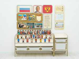 Уголок по патриотическому воспитанию для группы детского сада. Содержит основную символику РФ, панели для размещения работ воспитанников, набор разборных кукол, контейнеры для размещения книг. Соответствует требованиям ФГОС