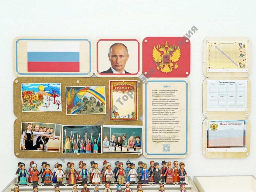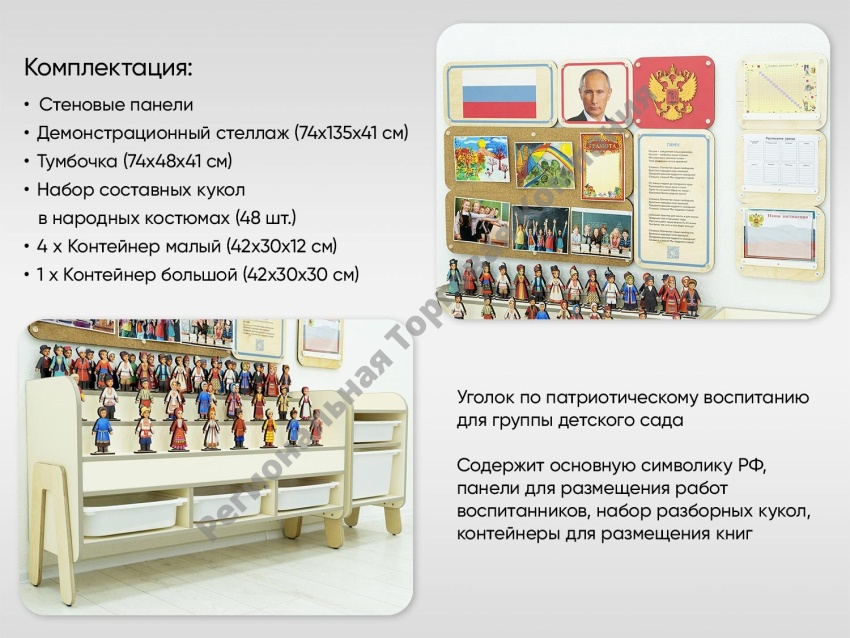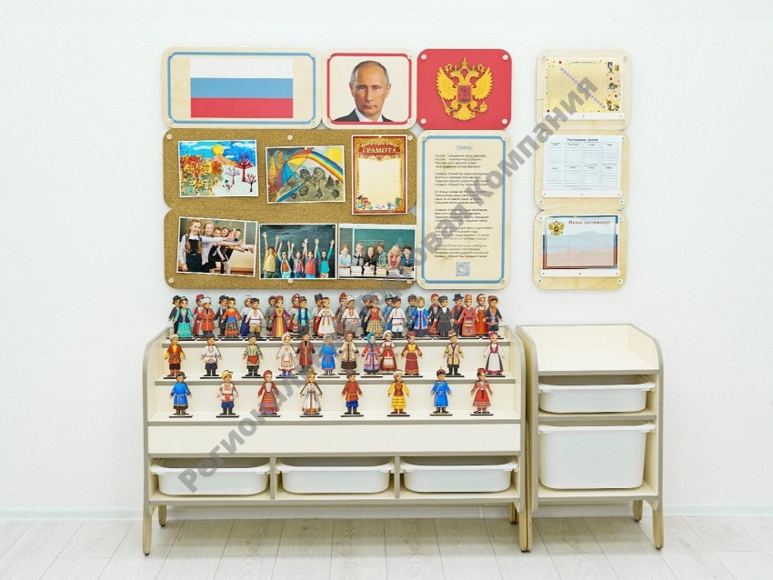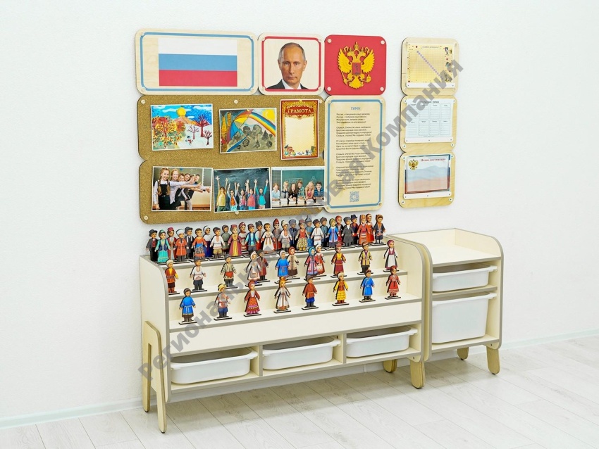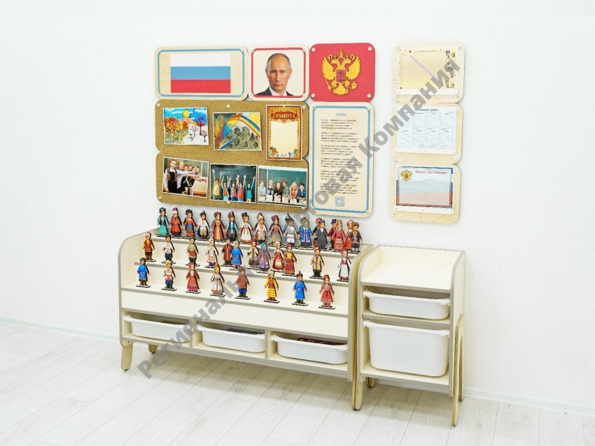 Уголок по патриотическому воспитанию для группы детского сада. Содержит основную символику РФ, панели для размещения работ воспитанников, набор разборных кукол, контейнеры для размещения книг. Соответствует требованиям ФГОС 3.