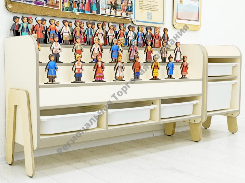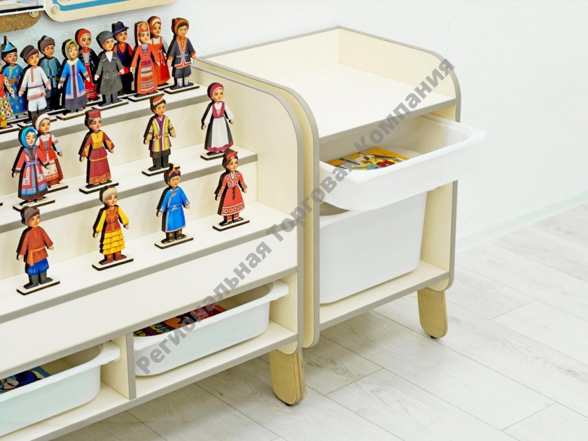 Для изучения национального разнообразия России в комплектации есть куклы в народных костюмах (24 национальности, 48 кукол). Они выполнены из берёзовой фанеры и ДВП с нанесением принтерной печати. Куклы разборные: голова, верхняя часть туловища и нижняя часть надеваются на основу-подставку. Играя в них, дети могут составлять различные вариации одежды куколок – правильные и неправильные, искать пары, разыгрывать сюжетно-ролевые сценки, параллельно запоминая национальности и их традиционные костюмы.