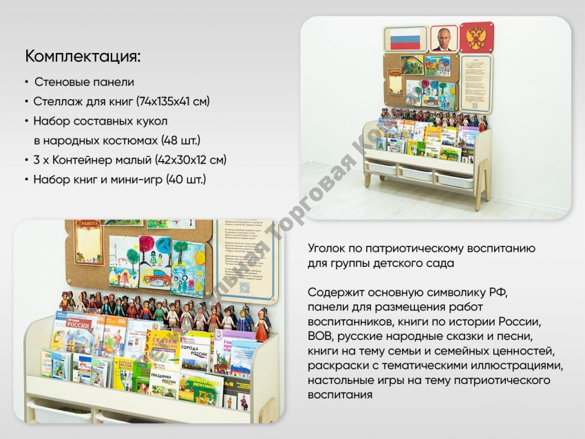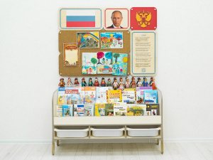 Уголок по патриотическому воспитанию для группы детского сада. Содержит основную символику РФ, панели для размещения работ воспитанников, книги по истории России, ВОВ, русские народные сказки и песни, книги на тему семьи и семейных ценностей, раскраски с тематическими иллюстрациями, настольные игры на тему патриотического воспитания. Соответствует требованиям ФГОС 3