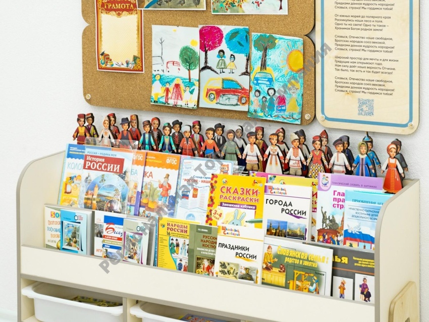 Нашими методистами собраны книги, раскраски и настольные игры для создания полноценного курса по патриотическому воспитанию. Удобные стеллажи с полками и ящиками содержат всё необходимое наполнение, чтобы проводить занятия с дошкольниками 3-6 лет.