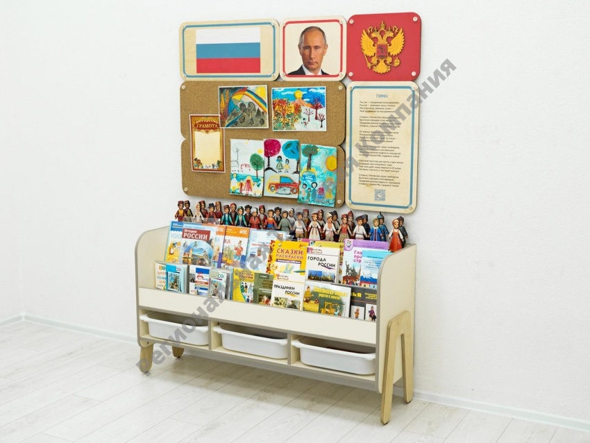 Уголок по патриотическому воспитанию для группы детского сада. Содержит основную символику РФ, панели для размещения работ воспитанников, книги по истории России, ВОВ, русские народные сказки и песни, книги на тему семьи и семейных ценностей, раскраски с тематическими иллюстрациями, настольные игры на тему патриотического воспитания. Соответствует требованиям ФГОС 3.