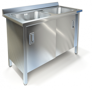 Две цельнотянутые ёмкости размером 500х400х250 из нержавеющей стали марки AISI 304 толщиной 1мм, обнижение 15 мм. Объемный пристенный борт. Корпус сварной из нержавеющей стали марки AISI 430 толщиной 0,8мм. Двери-купе, полка. Ванна комплектуется выпуском с нержавеющей решеткой и механическим запорным клапаном, диаметр выпуска 90мм, диаметр подключаемого сифона 50мм, перелив, регулируемые опоры. На дно ванны нанесена виброшумоизоляция. Ванна поставляется в собранном виде.