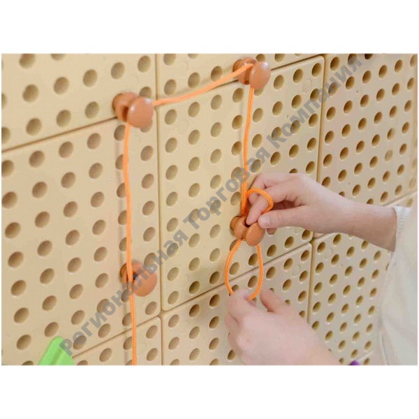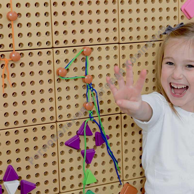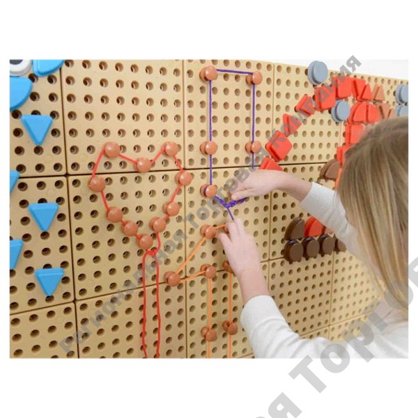 Игровой набор является дополнением к STEM стене, поставляется с 200 шнуровочными колышками и 30 шнурами длиной один метр в 6 ярких цветах (красный, оранжевый, синий, зеленый, желтый, фиолетовый). Подходит для создания геометрических фигур, букв или цифр. Вставляем колышки, а затем фиксируем на них шнурки.