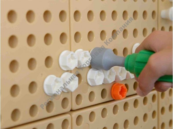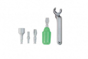 Набор состоит из: 4 сменных насадок (3 в виде отверток с различными шлицами, 1 в виде головки гаечного ключа), 1 рожковый гаечный ключ, ручка для насадок для ручной работы. Цвет насадок серый, цвет ручки зеленый. Детали изготовлены из атмосферостойких материалов, подходит для внутреннего и наружного использования.