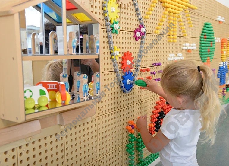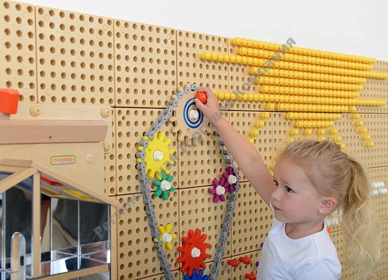 Набор состоит из шестеренок, цепи, винтов и колышек. Каждая шестеренка включает в себя центральный подшипник, который можно закрепить на стене при помощи винтов. Зубья шестеренок имеют закругленные концы для удобства соединения с другими шестернями. В наборе имеются 2 ручных зубчатых колеса, с помощью которых приводятся в движение шестерни. Детали устойчивы к выцветанию и растрескиванию на солнце.