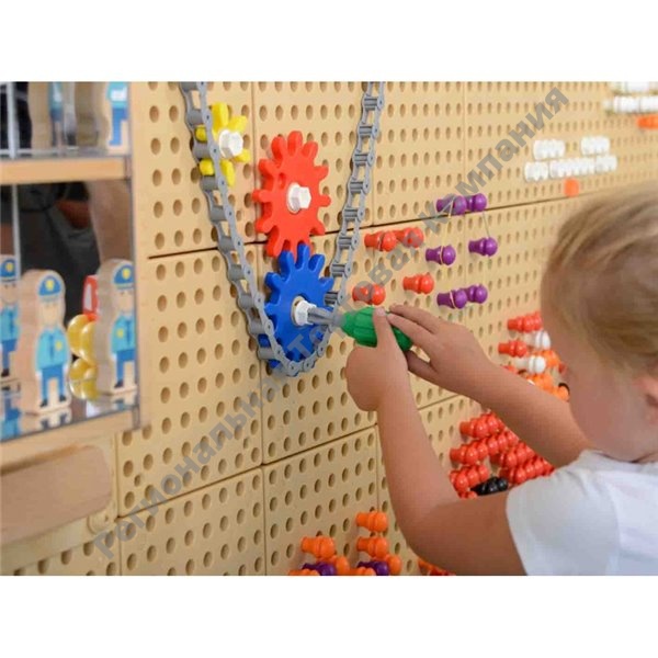 СТЕМ стена имеет возможность дополнительной установки развивающих пособий Masterkidz, таких как (колышки, шестеренки, сокровища, шнуровки, винты, кинетические треки, развивающие панели) и множество других интересный пособий, что обеспечивают постоянные новые задачи и позволяют детям ежедневно получать новый опыт и совершать новые открытия, таким образом обычная стена превращается в супер-игрушку для веселого и интерактивного обучения!