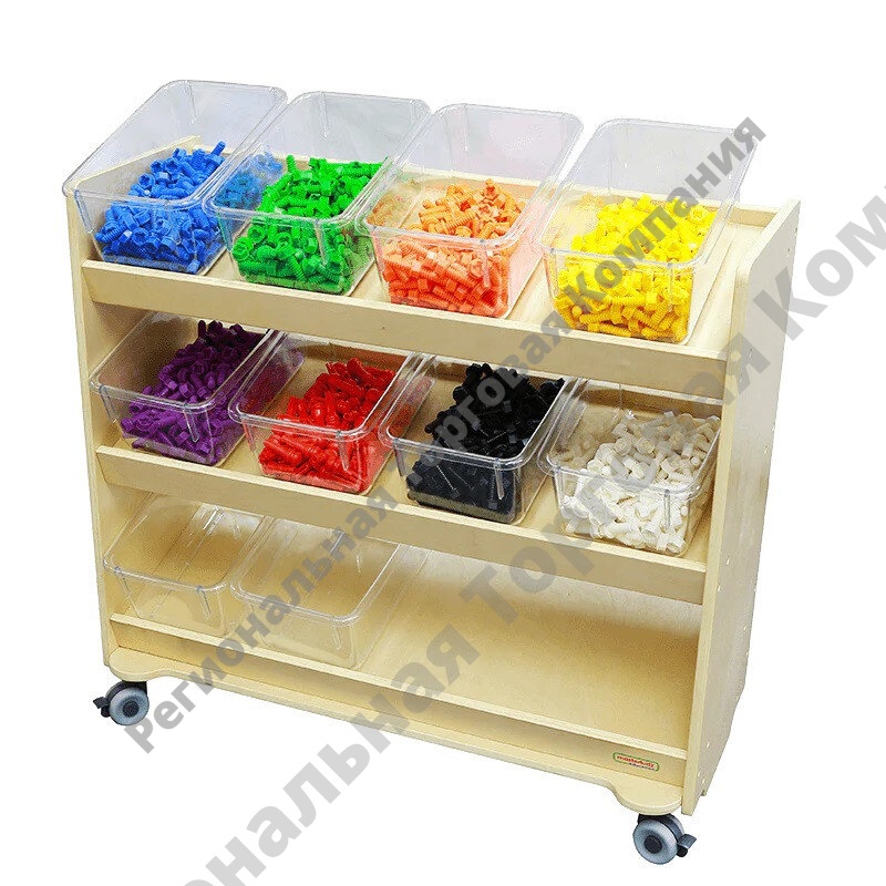 Система хранения представляет собой передвижной стеллаж с 1 верхней прямой полкой и с 2-мя наклонными. Рассчитана для размещения 12 прозрачных лотков. Лотки в комплект не входят. Выполнена из березовой фанеры. В нижней части стеллажа имеется основание с колесами.